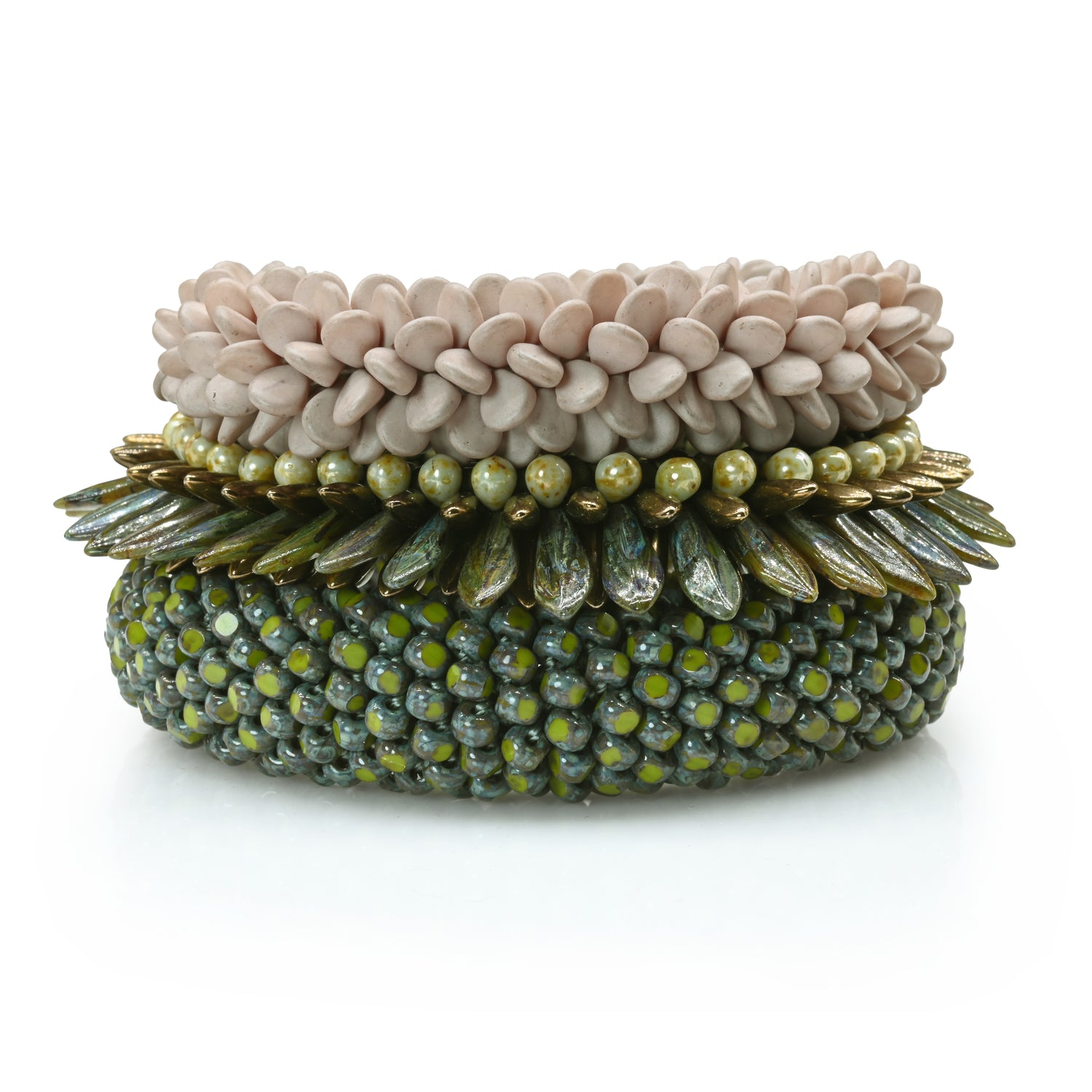 Olga’s signature style derives from her use of bead crochet. This centuries-old technique allows for great creative freedom when combined with modern materials. A crochet hook, thread and beads is all that’s needed to create anything from simple ropes to nature inspired sculptural shapes. The resulting pieces exhibit a unique fiber-like quality and textures that invite touch.