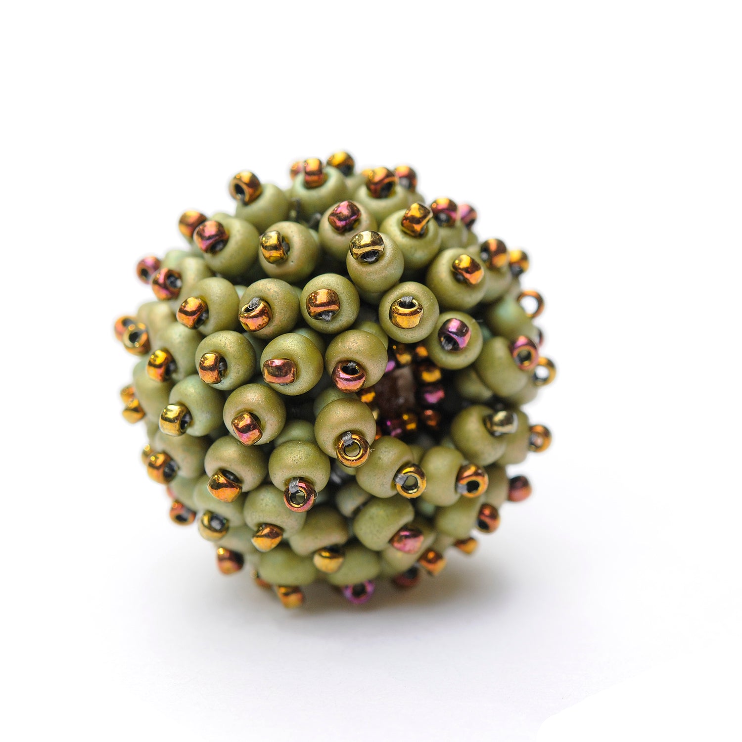 A wooden bead is covered with glass seed beads that are stitched around it. Then the beaded surface is embellished by adding a fringe to each of the beads of the base. The resulting beaded bead is about 23mm or 3/4" in diameter. The hole is about 3mm.
