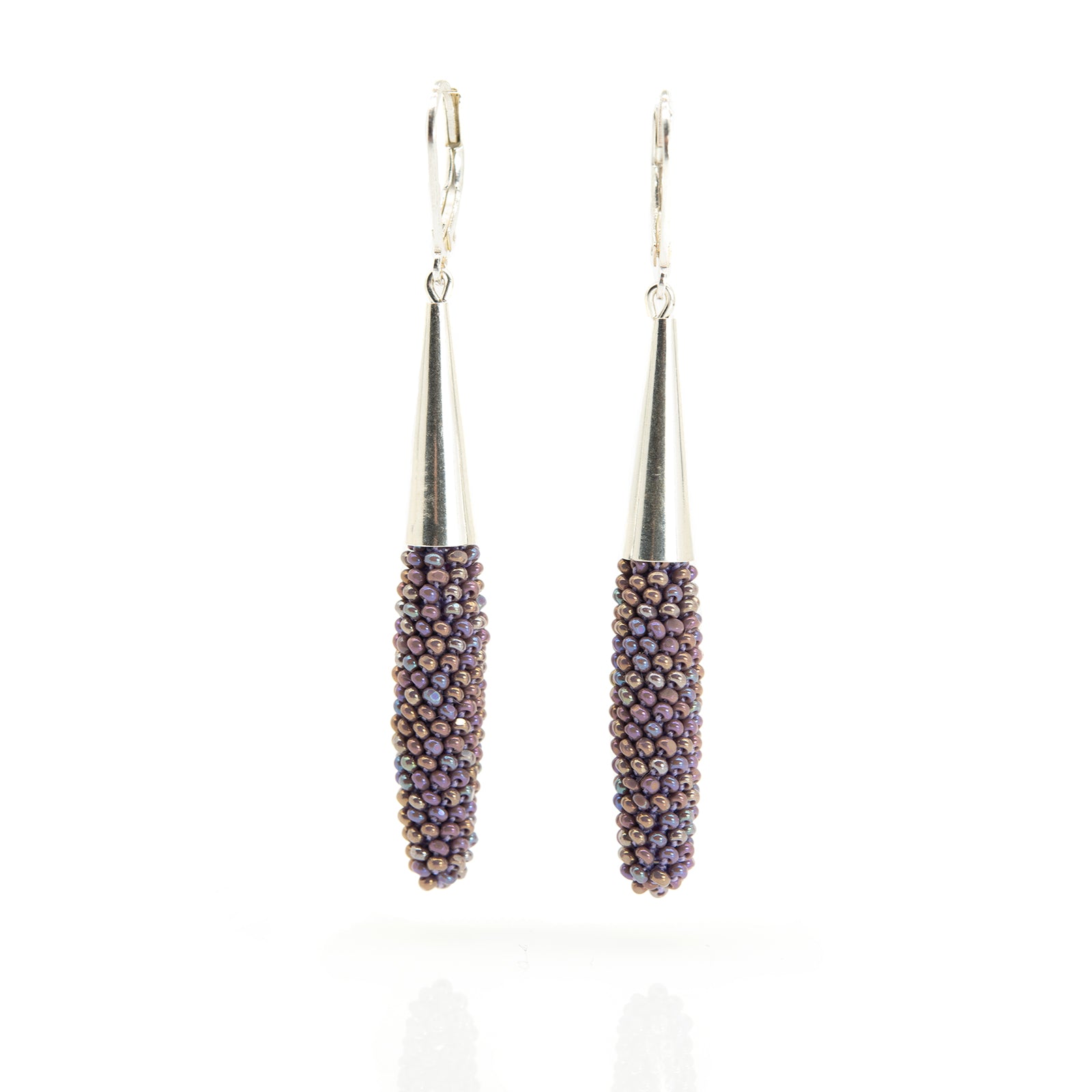 • Tiny Czech charlottes or seed beads are crocheted around acrylic ovals and finished with sterling silver cones and lever back earwires. The earrings are 2.5″ long and very light at just 3g each. Please specify whether you would like bright or oxidized silver finish.